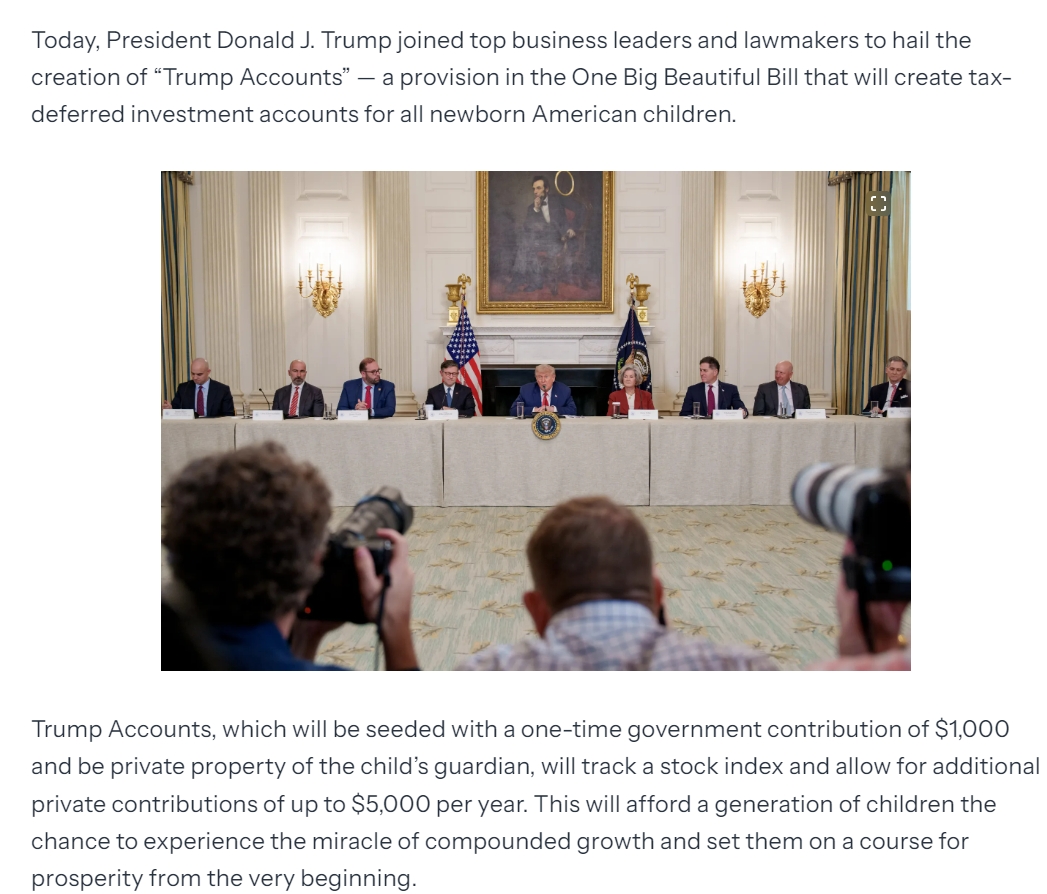 具体来看,政府出资的1000美元将存入一个与整个股票市场挂钩的指数基金,由孩子的法定监护人管理。每个孩子的账户起始金额为1000美元,监护人或其他私人实体可在孩子的整个生命周期内每年额外缴款最多5000美元。这些资金将投资于跟踪美国股市大盘的指数基金。